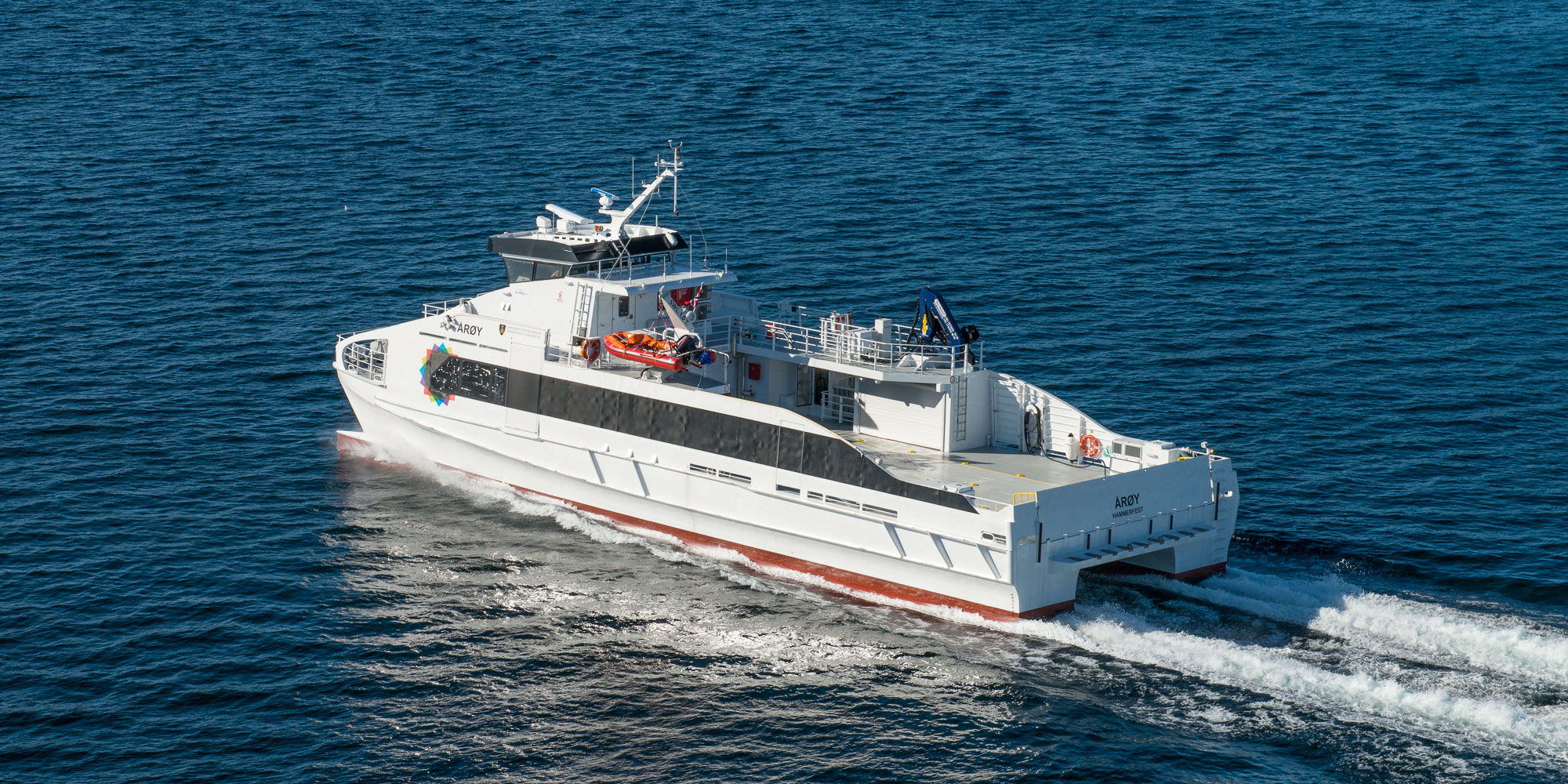 The catamaran has seating capacity for 70 passengers in the saloon and deck space for 8 – 10 passenger cars, alternatively 4 cars and one standard bus or semi. From 2016, the vessel is scheduled to operate on Route 310, the AltafjordXpressen, serving three connections from Mikkelsby: Rongsundstedene, Kongshus, and Nyvoll/Korsfjord.